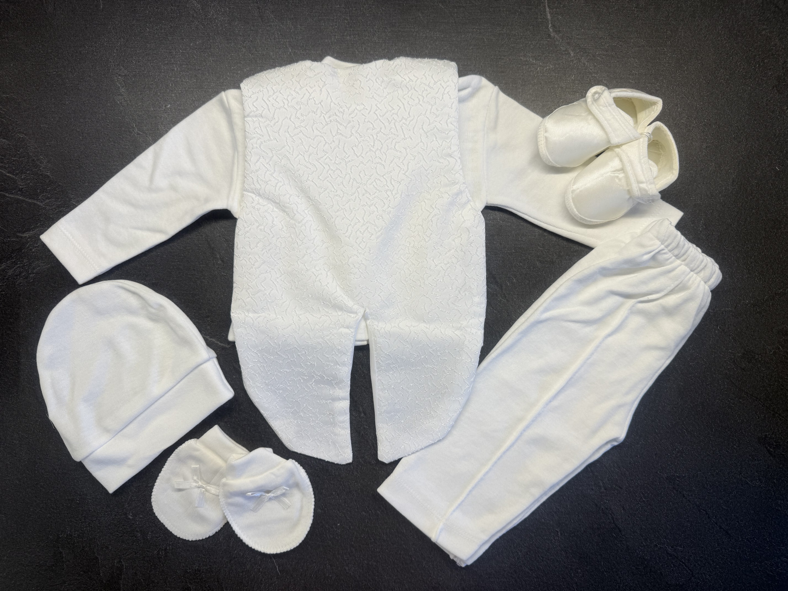 Souprava obsahuje košilku s motýlkem, vestičku s frakem, kalhoty, čepici, rukavičky a saténové bačkůrky.